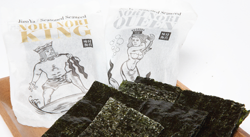 そんな私たちの自慢の味付海苔を一人でも多くの人に食べてもらうために、見た人が笑顔になるようなパッケージにしようと作り上げたのが看板商品「ノリノリキング」と「ノリノリクイーン」です。